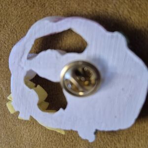 Charming Easter bunny pin in a basket with colorful eggs. Features pastel pink, yellow, and blue accents.