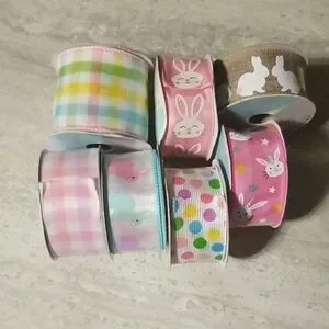 Set of colorful ribbons featuring Easter bunny designs. Includes pastel shades and playful patterns.