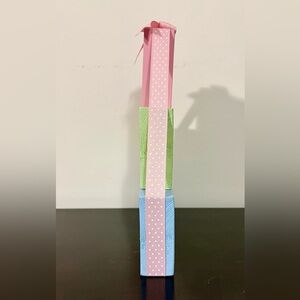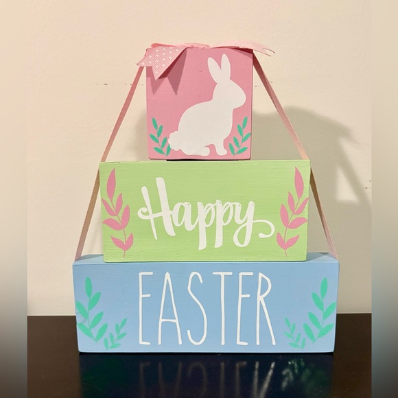 Colorful Easter blocks with bunny and floral designs. Perfect for festive decor. Made from 2x4 by 1.5” wide. Hand painted and sanded. Cricut vinyl designs.