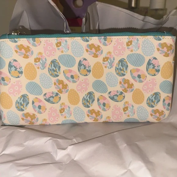 This vibrant Easter pouch has a unique design all around with a gold zipper and tassel that has white strings coming down. In the inside it is all black with the designer logo imprinted. This pouch is perfect for makeup of you can use it as a pencil case