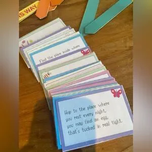 48pc laminated cards for a scavenger hunt (these are fantastic little rhyming clues, lovingly handmade by a local mom)