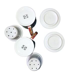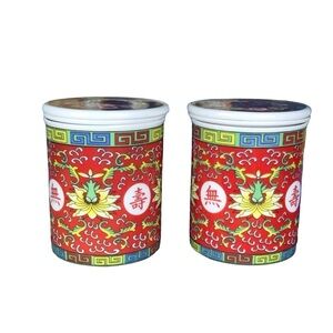 Eastern Asian Jingdezhen Red Longevity Lotus Porcelain Tea Infuser Lidded Cups are in very good preloved condition. There is a small chip on one. Please see pics for overall condition. Red in colour with classic Mun Shou design which incorporate blue, green, yellow and white. Lotus and Chinese characters are highlighted by design. Each teacup has an insert for teabag and a lid with same design. Hand wash.
