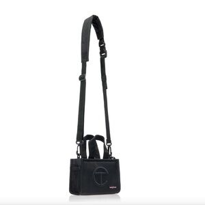 The iconic Small Shopper in tactical canvas with woven hand straps and removable/adjustable padded shoulder strap to be worn crossbody, around the waist or over the shoulder. Exterior features embossed Telfar logo, top zipper closure, and side mesh pockets, interior has velcro inner compartments.