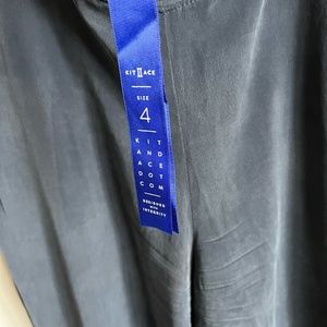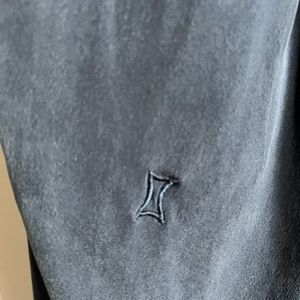 Comfortable but chic luxe silk blend high waist joggers. Dress them up or dress them down - wear them everywhere! Dark blue with black band at waist. Two front zippered pockets
