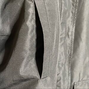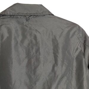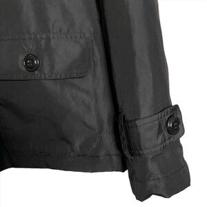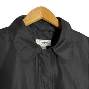 Features: Black, Easy Spirit, Light Jacket, Black, Windbreaker like outer shell, lined with soft/warm fleece on top with quilting on bottom, button and strap detail on cuffs, has belt loop but didn't come with belt, missing detachable hood, 2 front pockets with button closure, 2 vertical slide in breast pockets, button thread slightly loose on right sleeve (see photos for details), light jacket, spring, fall, collared, zip up front with buttoned storm flap, casual