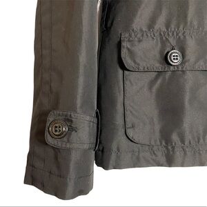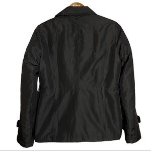 Features: Black, Easy Spirit, Light Jacket, Black, Windbreaker like outer shell, lined with soft/warm fleece on top with quilting on bottom, button and strap detail on cuffs, has belt loop but didn't come with belt, missing detachable hood, 2 front pockets with button closure, 2 vertical slide in breast pockets, button thread slightly loose on right sleeve (see photos for details), light jacket, spring, fall, collared, zip up front with buttoned storm flap, casual