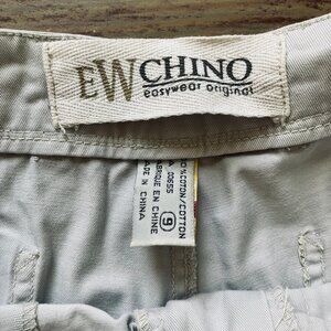 Vintage Easy Wear brand chino shorts have carpenter-style loop & pockets at the sides of legs. Front pockets have hook & loop closures. Two back pockets. 100% cotton, stone beige color. Women's size "9", fits 32" waist - see below for garment measurements.