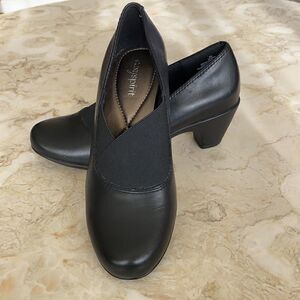 In practically new condition comfortable Easy Spirit Catava pumps in black leather with a semi-gloss finish. Elastic stretch fabric top. Needle stitched. Slightly rounded toe. Soft microfiber fabric lining. Flexible midsole. Comfort padded Efinity shock absorbing foam footbed. 2 1/2 inch stable heel Non-slip outsole. Great day to evening shoes !