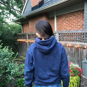 size large, boxercraft hoodie with navy blue with pink and white text on the front as well as a white sparkly silhoute of a horse and one front pocket. Pink, white, and blue plaid lining. Previously owned, good condition.