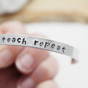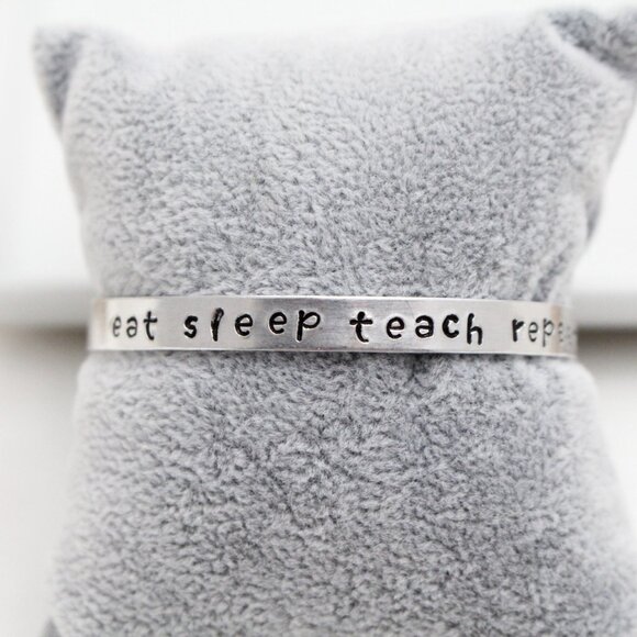 Eat Sleep Teach Repeat - Hand Stamped Anodized Aluminum Bangle - Adjustable