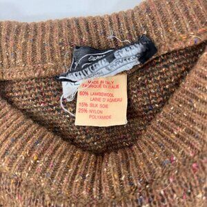 Pre-owned vintage Eaton European Collection Men's Brown Color Fleck Knit Sweater made in Italy of Lambswool, Silk, and Nylon, size XL. Pit to pit measurement is 25" and length is 24.5". Excellent vintage condition. Please review photos closely for further details.