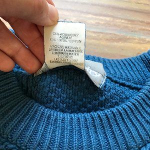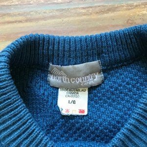 Vintage Eaton North Country blue textured knit pullover sweater has geometric all over design. Tag size is unisex "Large", see below for garment measurements. 50% acrylic/50% cotton for easy wash/wear. Made in Canada. Pre-owned condition, knit fabric has some pilling as is typical in a knit garment.