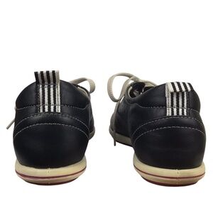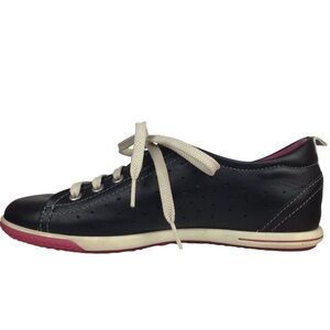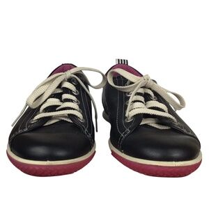 Stylish and comfortable black leather shoes with white laces, ivory leather interior, and pink soles.