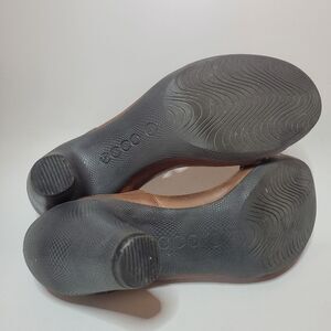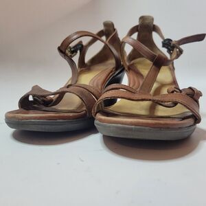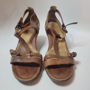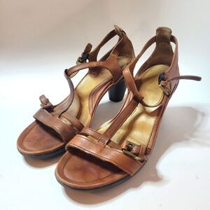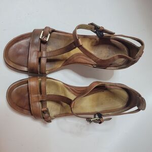 Soft leather brown leather t-strap sandals with a soft leather foot bed and comfort fit rubber soles and heel. Adjustable fit strap buckles and elastic. Good used condition, see pics for further details. Size 41