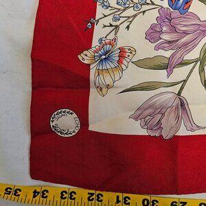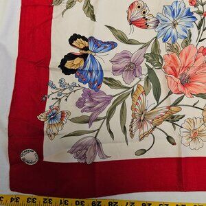 This Echo Limited Edition silk scarf is a true statement piece, featuring a vibrant red border and an enchanting design of butterflies and flowers. Crafted from luxurious silk, it measures 34 inches square, offering versatile styling options. Elevate your wardrobe with this timeless and elegant accessory. A collector’s dream!