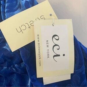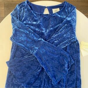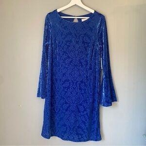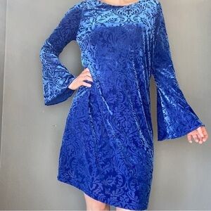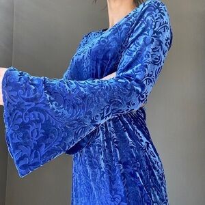 Eci New York blue bohemian bell-sleeve velvet dress. New with tags. Keyhole cutout in back with button. Gorgeous textured pattern. Soft, stretchy material. Excellent condition. A unique and colourful addition to your wardrobe!