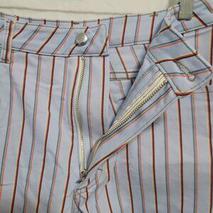 Lightweight pants in a powder blue with multi colour stripes, front and back curved pockets, zip and button closure.