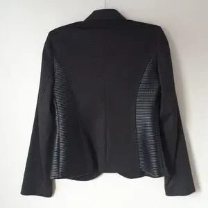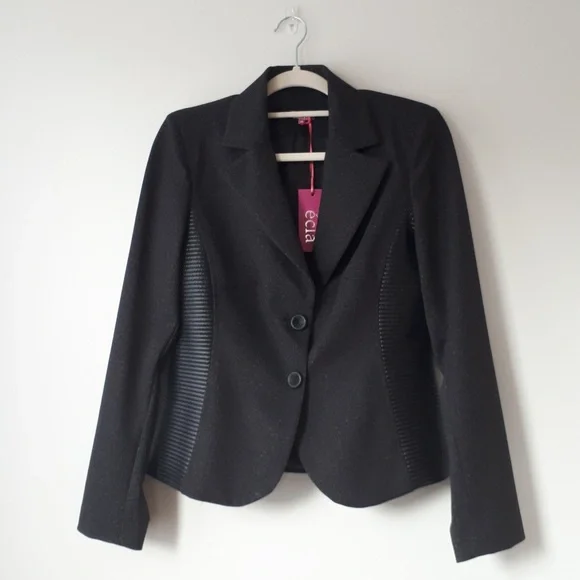 Grey heathered blazer with black textured sides that look like leather. Two button in front. No pockets. Italian brand. 50% poly, 45% viscose and 5% elastane. New with tags.