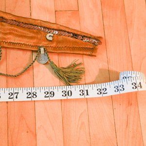 Worn once by Tanya Lee of Body Art Motion for Circle Carnival performance 2016. Super fun performance piece handmade in Calgary Canada by Lunacy Adornments. Small cup size approx. A-B. Behind the neck wraps at 19 inches with elastic at apex. Single heavy duty clasp at back and measures 32 inches around, non-elastic. Earthy color palette of gold, cream, brown and gold with antique coin and button accents.