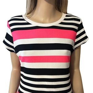 Features: Bold colour block stripes featuring neon pink, black and white, rounded neckline, pullover design, short sleeve, darted bust line, bodycon silhouette, sharp asymmetrical front hemline, stretch fabric