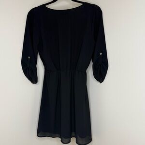 Chic and timeless longline black blouse featuring a flattering deep V neckline, three quarter sleeves, and gold button accents for a touch of sophistication. Perfect to pair with leggings, jeans, or dress pants for a sleek day-to-night look.