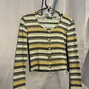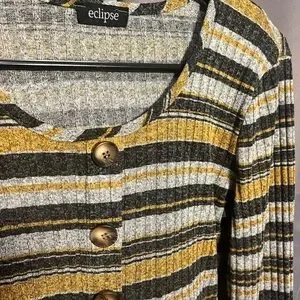 Chic Eclipse top with multicolor stripes. Features button-up design.