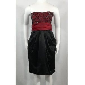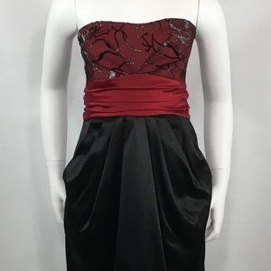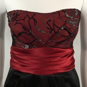Black satin skirt and back. Cranberry red satin cummerbund effect at front waist. Lightly boned bodice has overlay of black and silver netting. Elastic at back bodice, back zip. Unlined. Fits small, please check measurements.