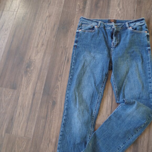 Eco Friendly jeans by F&F made in Pakistan.size US10,Eu42,and Uk14R.the inseam is 30" long.These jeans are disigned to use less water ,energy and chemicals.they are certified by Eim software,powered Jeanologia.By F&F brand.they are medium wash.They are straight leg.They are High rise 11" inches to crotch.