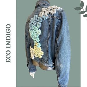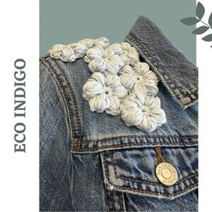 Eco Indigo Upcycled Jean Jacket Floral Crochet Flowers Cotton Blue Size Large