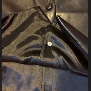 Eco friendly black oversized faux leather vest new with tags. Supple faux-leather, full satiny lining, piped trompe-l'oeil front pockets, covered buttons. Shell : 100% polyurethane, back : 100% reprocessed polyester, lining : 95% recycled polyester, 5% spandex. Marked size XS / S but it fits larger in my opinion, like a M or even a small L, please see measurements. All measurements are approximate and taken with the garment laying flat: Armpit to armpit 18.5" Total length 22". This item comes from a smoke free, pets friendly home. Recycled bags/box used when possible. Please, let me know if you'd like any additional pictures and/or measurements or other info. Thanks for watching!