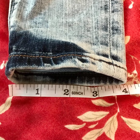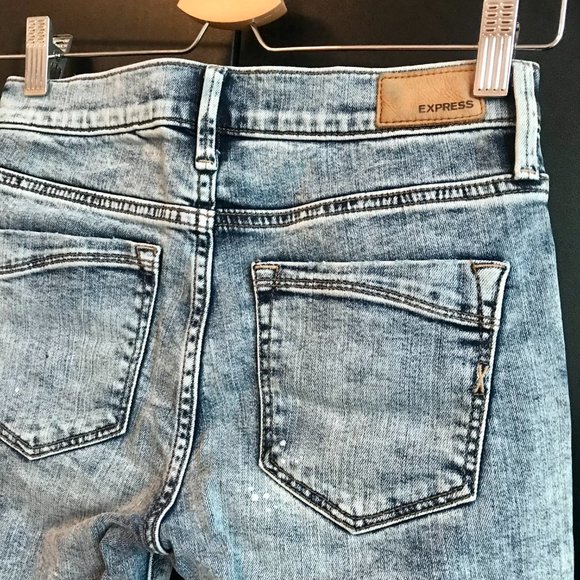 -Light wash distressed denim with paint splatter/white flecked detailing