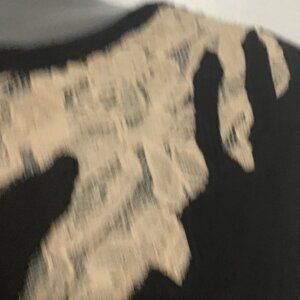 Features: Bell shaped 3/4 sleeves, black semi-sheer, gauze like fabric with cream lace, open back with tie at neck.