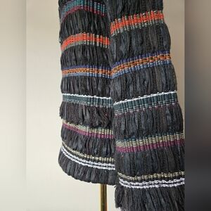 Beautiful and unique woven knit and fringe blazer with embroidered multicolor stripes. Collarless with a hook and loop front closures. Unlined.
