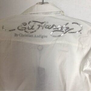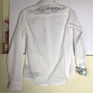 Ed Hardy NEW Vintage Logo Sequins Embroidery Shirt Floral Cotton Button Blouse S