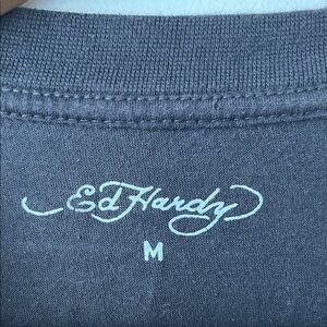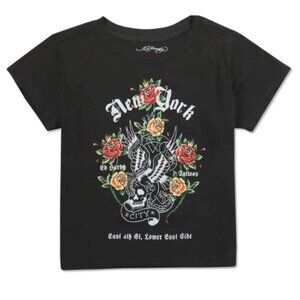 Gray tee featuring faded vintage New York text with signature floral graphics. Classic Ed Hardy style — edgy and eye-catching.