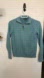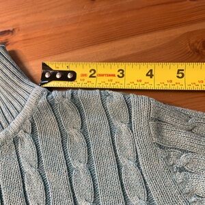 This is in excellent used condition. It’s actually a light cable knit so would be good for inside in the winter. Cute leather zipper detail. Soft teal color.