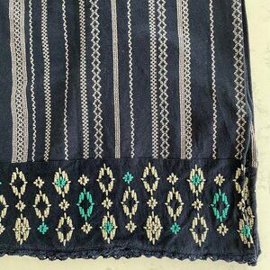 Features: striped body in Navy & Grey, 100% Cotton, large wrap, 4" embroidered panel at ends in Green & Cream in Diamond shapes, eyelet trim, versatile worn several ways, casual, travel, vacation, unisex, great paired w denim pieces
