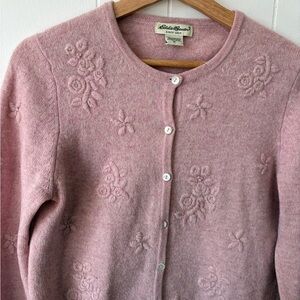 Eddie Bauer 100% Lambswool Pink Embroidered Cardigan | Size Medium