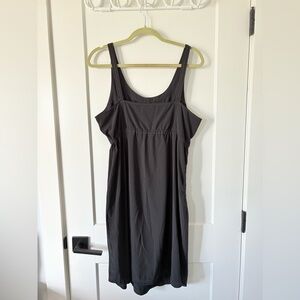 Chic black midi dress with button-front detail. Sleeveless design. Perfect for casual outings.