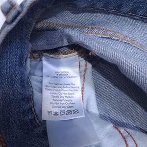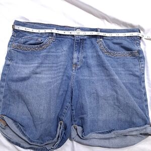 Eddie Bauer | Blue embroidered women's jean shorts pinned up sides. (sides are sewen up to make them look rolled up /pinned up) women's size 14