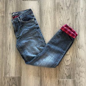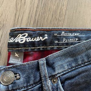 Eddie Bauer Boyfriend Flannel-Lined Jeans - Relaxed Fit. Size 2, blue with red plaid lining. Minimal wear. Super cozy!