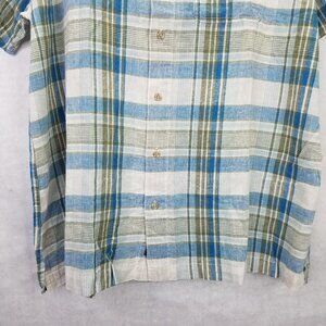 Eddie Bauer Camp Shirt Men's XXL Plaid Short Sleeve Button Up Blue Linen Cotton