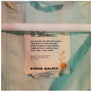 The jacket's striking mint blue hue is complemented by a sleek solid pattern and subtle accents such as the iconic Eddie Bauer logo and practical zipper details. Its hooded design and long sleeves offer added protection against the elements, while the zip closure ensures a secure and snug fit. Whether you're out for a casual stroll or enjoying a weekend outing, this jacket is a go-to for fall, spring, or summer.