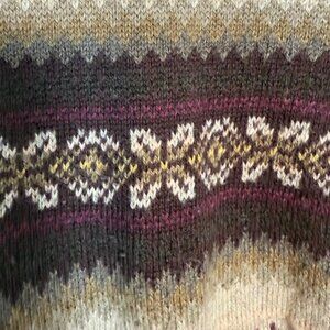 • Color: Brown, tan, cream, and plum in a Fair Isle stripe pattern