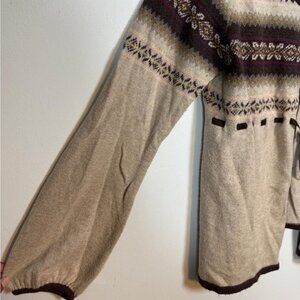 Keywords: Eddie Bauer cardigan, Fair Isle sweater, merino wool blend, boho cardigan, winter knitwear, layering sweater, ribbon tie cardigan