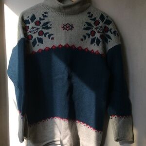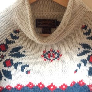 Dove grey and teal with red accents. Eddie Bauer Fair Isle sweater. 80/20 wool and nylon. Size small, oversized.