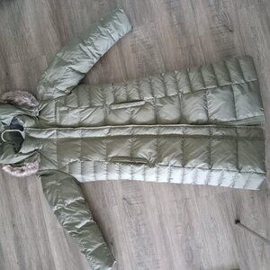 Stylish green puffer coat. Features fur-trimmed hood. Warm and comfortable.