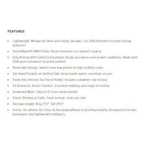Go lean and green. Windproof Pertex® ripstop shell and lining are made with recycled polyester. PrimaLoft® Gold Eco insulation is 55% recycled, and highly compressible, so jacket packs down into interior chest pocket for easy transport. Reversible design lets you choose from two contrasting colors, one quilted, one smooth-finished.