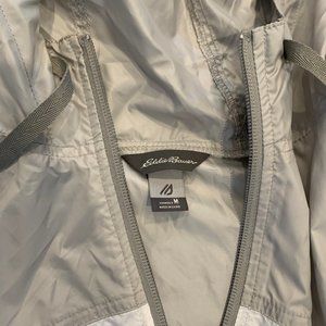 Eddie Bauer ultralight windproof jacket for the cooler hours in spring and summer. Colorblocked polyester shell with adjustable hood. Drawstrings and zip pockets. Never worn! Non smoking home.