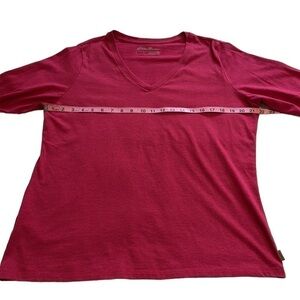 This fuchsia v-neck is in perfect condition. It was washed, but not worn. True to size.